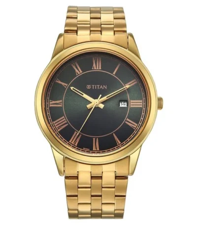 Titan Karishma Festive Analog with Green Dial Full Roman Numerals Yellow Gold Stainless Steel Strap Watch for Men