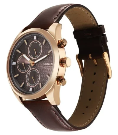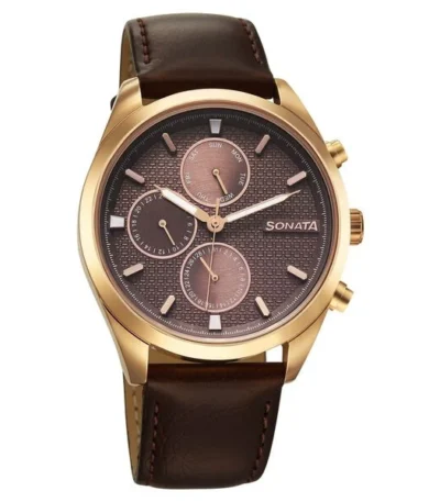 Sonata Magna Quartz Multifunction Brown Dial Rose Gold Leather Strap Watch For Men