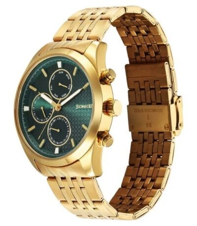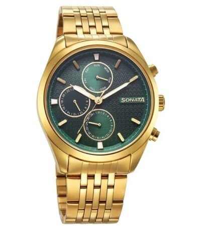 Sonata Magna Quartz Multifunction Green Dial Golden Stainless Steel Strap Watch For Men