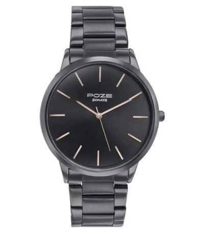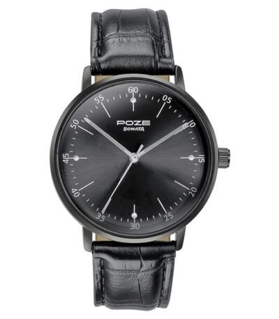 The SP70068NL01 is a Sonata Poze Deep Currants analog watch for men, featuring a black round dial, black leather strap, alloy case, and precise quartz movement, designed with a focus on bold style for casual wear, offering a classic look with modern durability. It’s part of Sonata’s “Deep Currants” collection, known for rich dial colors and strong visual statements, with a mineral glass face and limited warrant