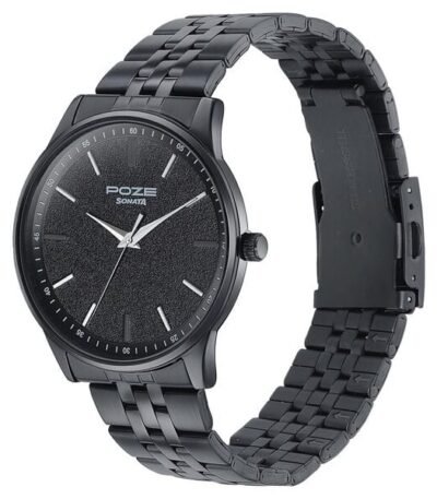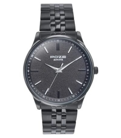 SP70045NM01 is the model number for a Sonata Poze Quartz Analog Watch for Men, featuring a black dial, black stainless steel strap, mineral glass, reliable quartz movement, and water resistance