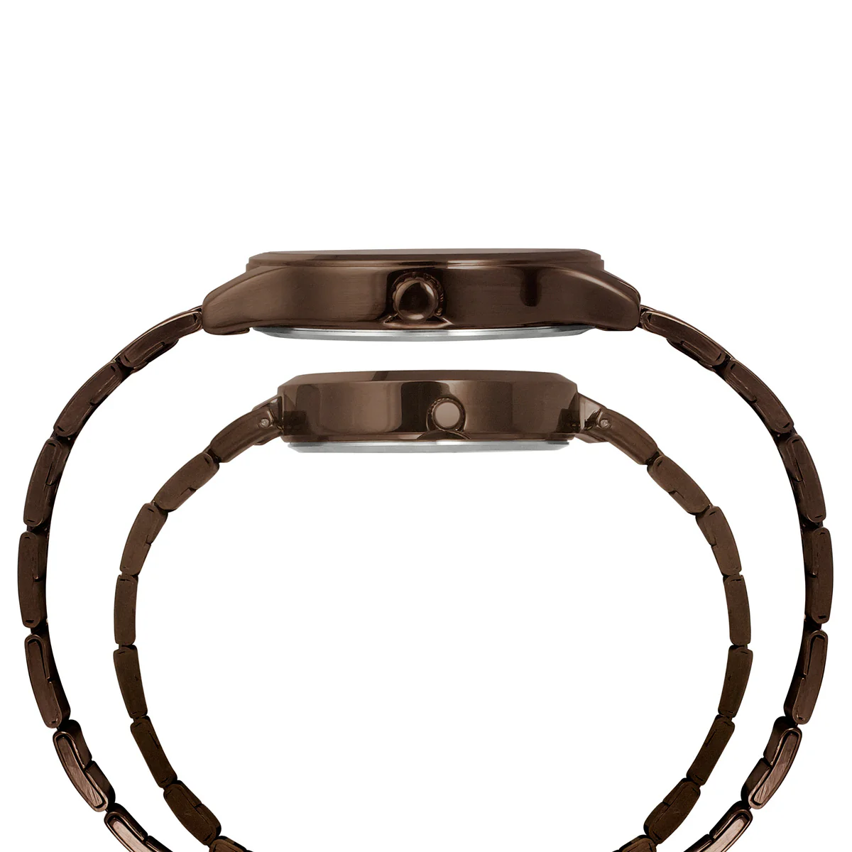 Discover Timex watch for couple, featuring a brown dial, a brown strap made of stainless steel in a round case. Built with mineral glass and stainless steel body to balance clarity and durability. Dimensions include 35 mm dial size, 22 mm strap width, 9 mm profile for comfortable wear. Key features: quartz movement, analog display, 3 atm water resistance. A secure push-button deployment ensures a dependable fit.