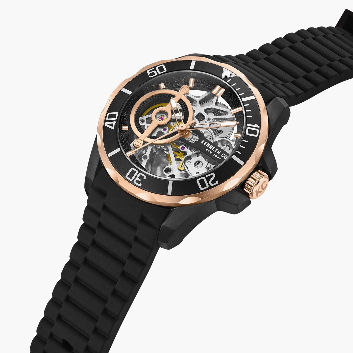 Kenneth Cole men’s automatic watch, featuring a black dial with skeleton details, a black silicone strap, and a 43mm case, powered by motion (self-winding) with mineral glass and 30m water resistance, available from retailers like Tata CLiQ, Titan, Myntra, and Lifestyle.