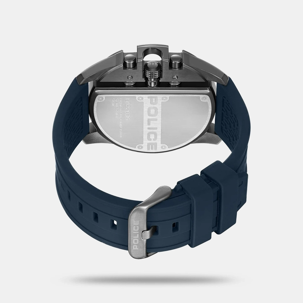 Daintree – an intimidating watch that needs no introduction. The distinctive semi-circle black and blue texured dial, screwed to the jaw-dropping crown guard, is undeniably striking. Police maintains its signature edge with the extreme look and feel. The durable blue silicone strap makes all-day wear comfortable and effortless.