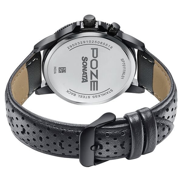 Poze by Sonata Quartz Analog Black Dial Black PU Leather Strap Watch for Men is a bold and sophisticated timepiece designed for everyday style. The all-black round dial adds a sleek and modern appeal, perfectly complemented by the black PU leather strap for a strong and confident look. Its sturdy metal case (50.5 mm length, 43.5 mm width, and 10.5 mm thickness) offers a solid wrist presence while maintaining comfort.