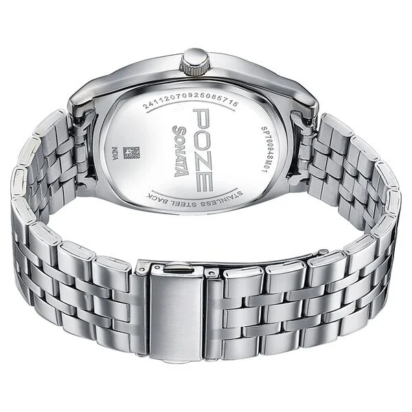 Poze by Sonata Quartz Analog Green Dial Silver Metal Strap Watch for Men is a modern and eye-catching timepiece designed for men who appreciate distinctive style. The vibrant green dial beautifully contrasts with the sleek silver metal strap, giving it a fresh and contemporary look. Its uniquely shaped metal case (49.5 mm length, 40 mm width, and 8.3 mm thickness) adds character, while the durable mineral glass enhances protection and long-lasting clarity.