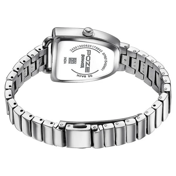 Poze by Sonata Quartz Analog Pink Dial Silver Metal Strap Watch for Women is a chic and elegant timepiece designed to add a soft feminine touch to your style. The delicate pink dial contrasts beautifully with the sleek silver metal strap, creating a graceful and modern look perfect for both daily wear and special occasions. Its distinctive special-shaped metal case (35.8 mm length, 26.5 mm width, and 8.5 mm thickness) offers a refined wrist presence, while the mineral glass ensures durability and clear visibility.