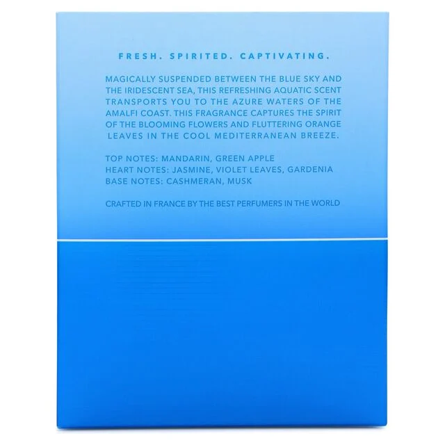 Fresh. Spirited. Captivating.Magically suspended between the blue sky and the iridescent sea, this refreshing aquatic scent transports you to the azure waters of the Amalfi Coast. This fragrance captures the spirit of the blooming flowers and fluttering orange leaves in the cool Mediterranean breeze.Top Notes: Mandarin, Green Apple Heart Notes: Jasmine, Violet leaves, Gardenia Base Notes: Cashmeran, Musk Crafted in France by the best perfumers in the world.