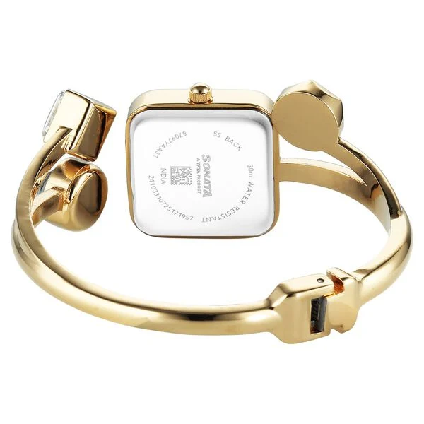 The Sonata Aura Quartz Analog White Mother of Pearl Dial Golden Stainless Steel Strap Watch For Women is a beautifully designed timepiece that blends elegance with a modern geometric touch.