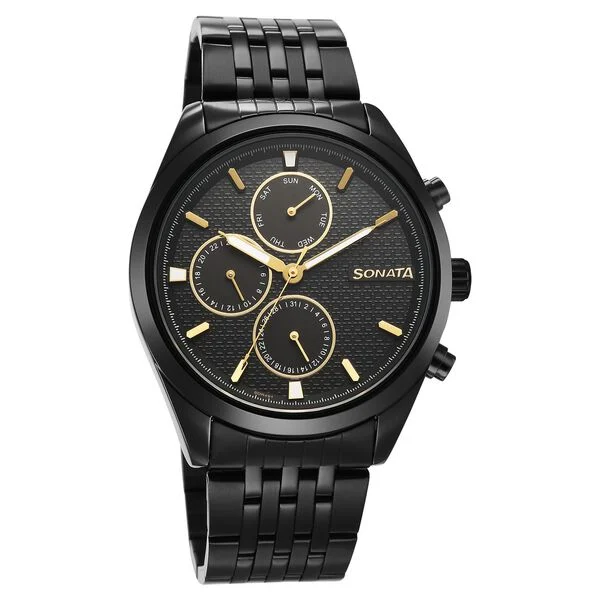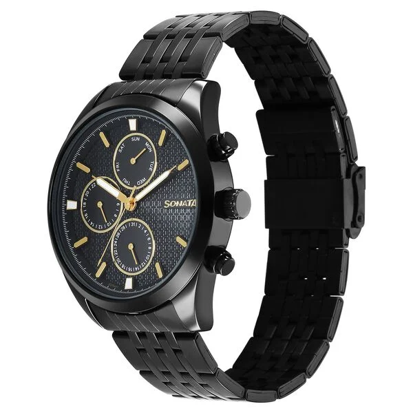 Sonata Magna Quartz Multifunction Black Dial Black Stainless Steel Strap Watch For Men