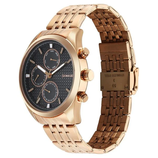 Sonata Magna Quartz Multifunction Black Dial Rose Gold Stainless Steel Strap Watch For Men