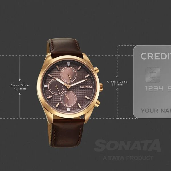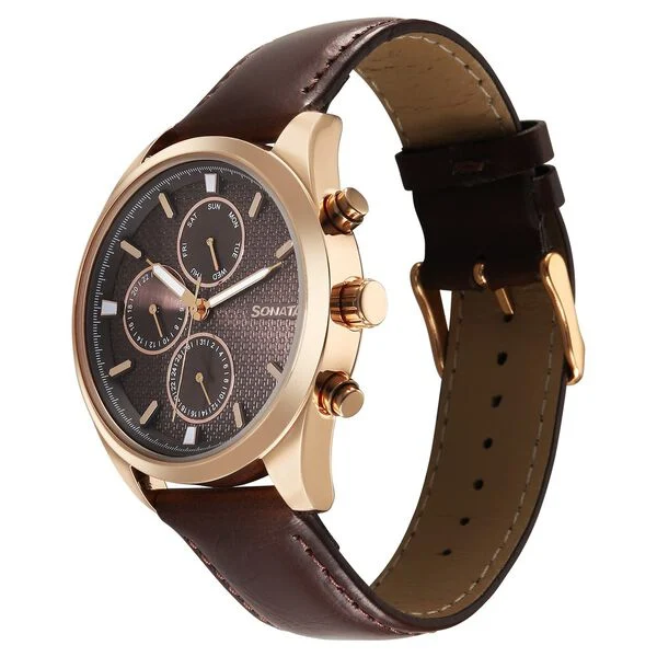 Sonata Magna Quartz Multifunction Brown Dial Rose Gold Leather Strap Watch For Men