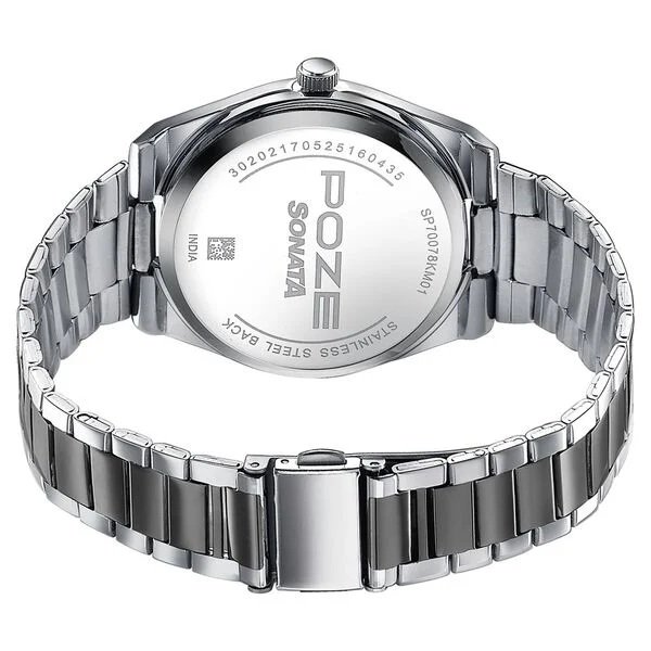 SP70078KM01 is the model number for the Sonata Poze Drop 6 Quartz Round Dial Men’s Watch, featuring a green analog dial, a multi-toned stainless steel strap, quartz movement, and water resistance, designed for both formal and casual wear