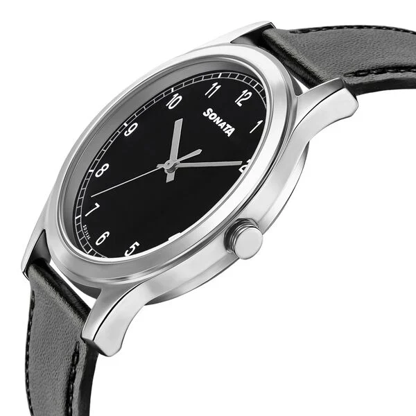 Sonata Quartz Analog Black Dial Leather Strap Watch for Men