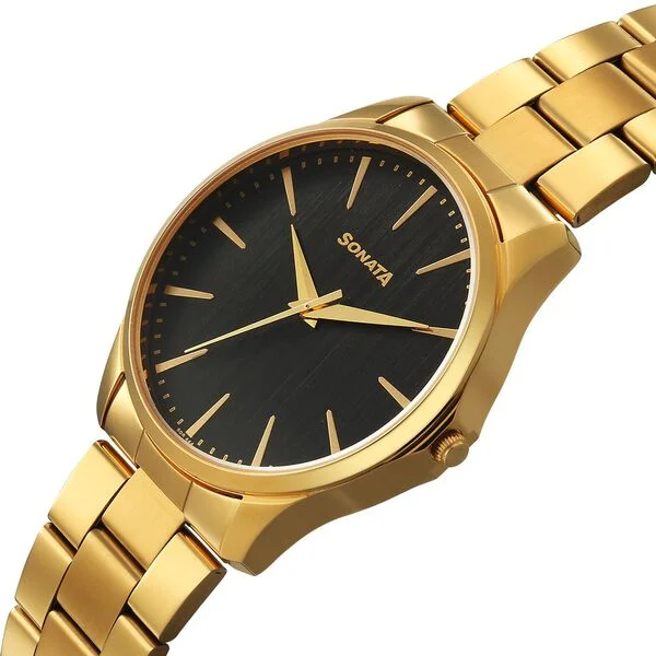 Sonata Traditional Essentials Quartz Analog Black Dial Golden Metal Strap Watch For Men