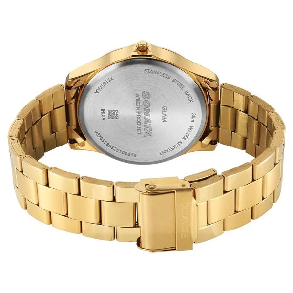 The Sonata Traditional Essentials Quartz Analog Black Dial Golden Metal Strap Watch For Men is a bold and elegant timepiece that perfectly balances classic style with modern appeal. The striking black dial contrasts beautifully with the golden metal strap, giving it a premium and eye-catching look suitable for festive occasions, formal events, and office wear.