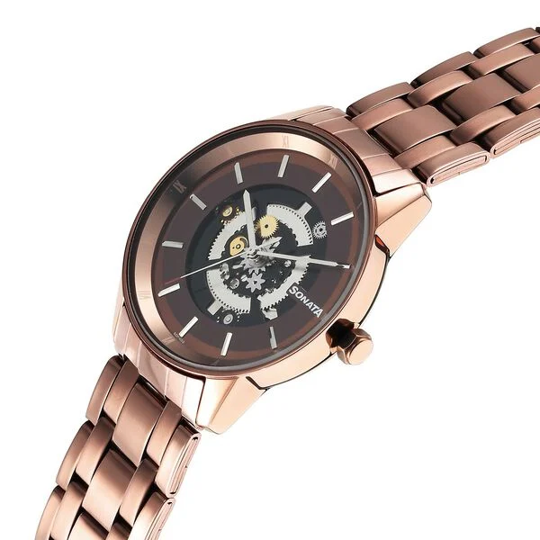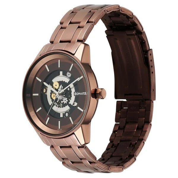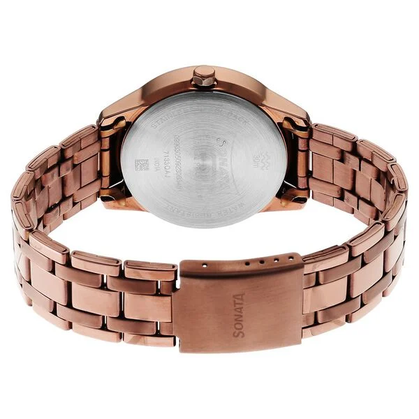 This Sonata analogue watch is a stylish and practical timepiece designed for everyday use. The pack contains a single watch featuring a printed round metal dial with an analogue display and precise quartz movement powered by a reliable battery. It comes with useful features such as reset time functionality and offers water resistance up to 30 meters, making it suitable for light splashes and daily wear. The watch is fitted with a brown stainless steel bracelet-style strap secured with a button closure, giving it a classic and elegant look. With a brown dial and matching strap, this non-Swiss made watch delivers a balanced blend of durability and style. It comes packaged in a signature Sonata case and includes a 1-year warranty provided by the brand owner/manufacturer, ensuring quality and peace of mind.