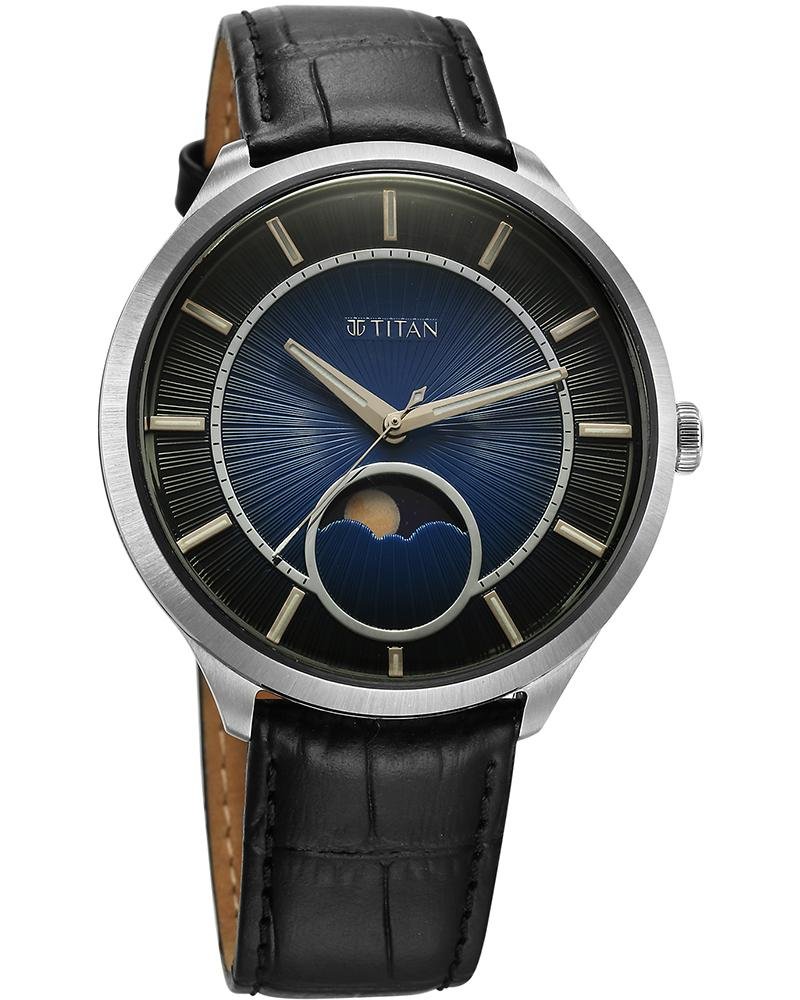 Inspired by the mesmerizing patterns of the sky – Caleum, this watch captures the essence of celestial beauty in a timepiece. Its gradient blue dial encased in a silver bezel, evokes the serene transition of twilight, while the in-house sun and moon phase sub-dial offers a sophisticated touch of cosmic rhythm. The luminous indices and hands ensure visibility in all light conditions, framed by domed mineral glass for a refined finish. Complemented by a premium black leather strap, this watch combines modern elegance with a tribute to the ever-changing sky. This vibrant watch can be effortlessly styled for celebratory occasions.