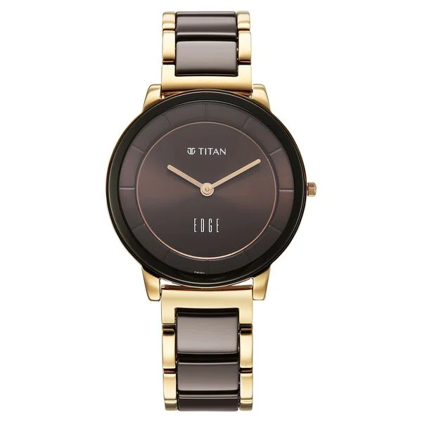 The Titan Edge Melange (2777kd01) is an ultra-slim luxury analog timepiece for women, featuring a sophisticated brown dial set within a round 38.5mm steel and ceramic case. Powered by precise quartz movement and protected by highly scratch-resistant sapphire crystal, this watch boasts an incredibly thin profile of just 4.3mm.