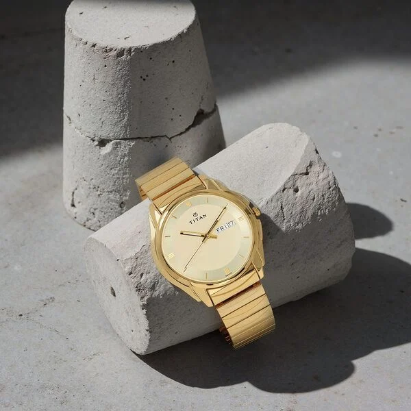 Titan Quartz Analog with Day and Date Champagne Dial Golden Stainless Steel Strap Watch For Men