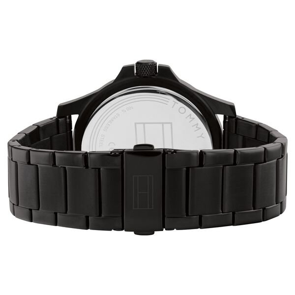 Tommy Hilfiger men’s analog watch, featuring a black dial, stainless steel case and bracelet, quartz movement, and 5 ATM water resistance, known for its sleek, modern design in the Ryan collection. It’s a popular timepiece found on various retail sites, characterized by its all-black look with a round dial.
