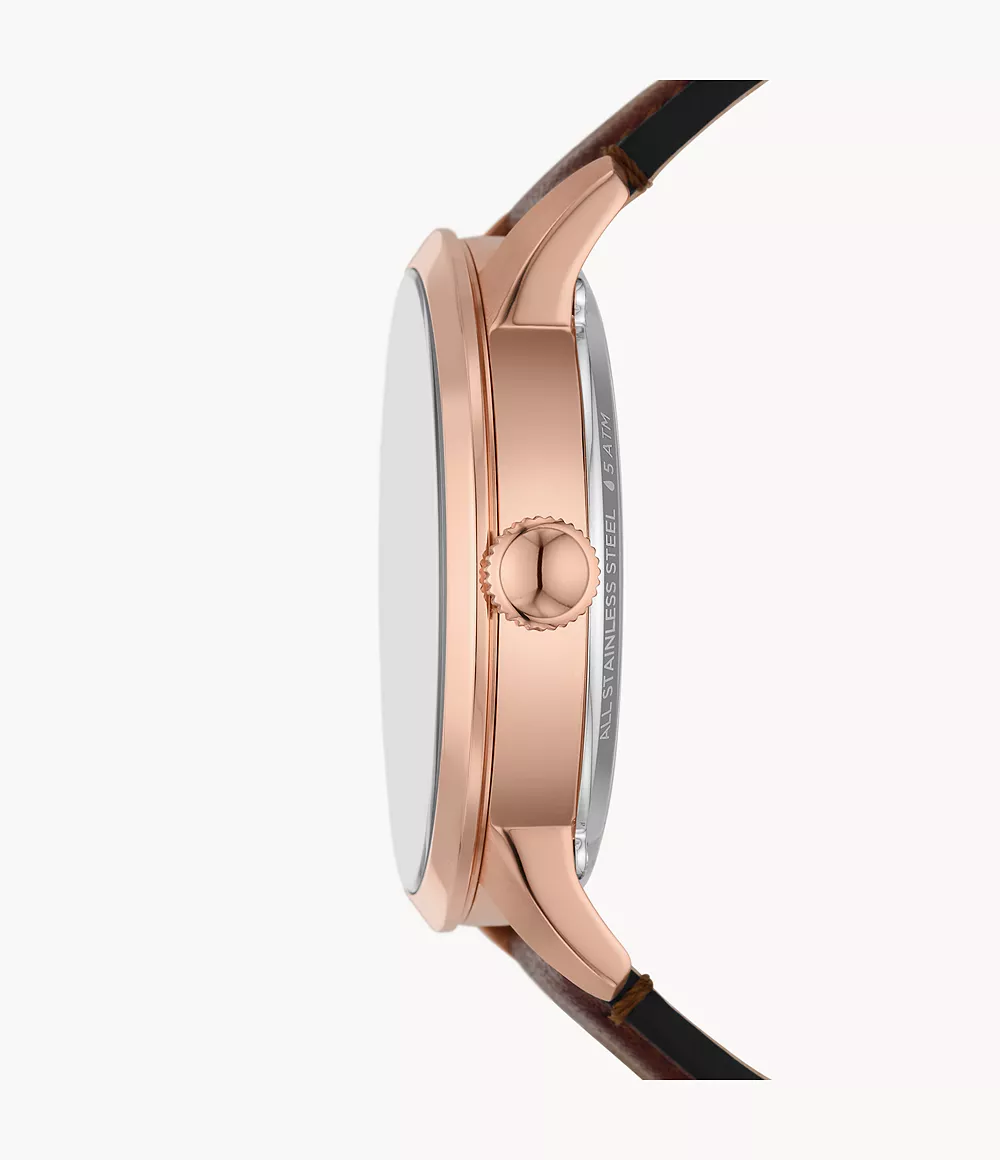 Inspired by vintage watch design, the Townsman Automatic is a casual dress watch with functional sensibility. It features a brown leather strap, a refined rose gold-tone case and an innovative skeleton dial with 3-hand automatic movement that winds as you wear it. Fossil leather products support responsible manufacturing via the Leather Working Group