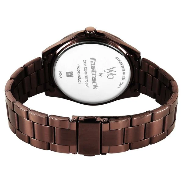 Vyb Drift by Fastrack Quartz Analog Brown Dial Brown Stainless Steel Strap Watch for Guys is a stylish and modern timepiece designed for a bold everyday look. The rich brown dial perfectly complements the matching brown stainless steel strap, creating a sleek and coordinated appearance. Its round metal case (48 mm length, 42.1 mm width, and 8.1 mm thickness) offers a strong yet refined wrist presence, while the mineral glass ensures durability and long-lasting clarity.