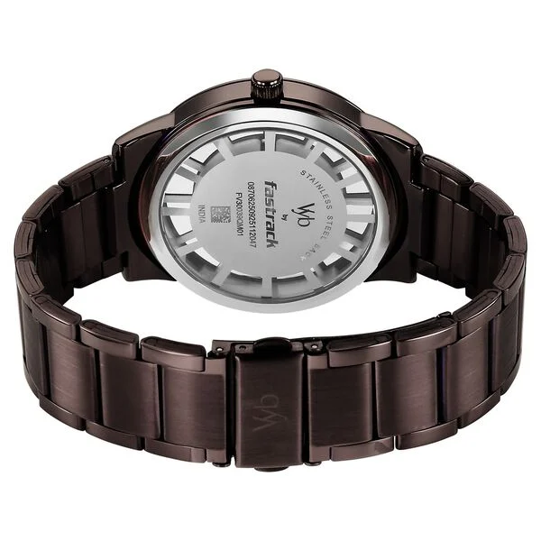 Vyb Horizon by Fastrack Quartz Analog Black Dial Brown Stainless Steel Strap Watch for Guys is a bold and contemporary timepiece crafted for a confident, modern look. The sleek black dial paired with a stylish brown stainless steel strap creates a striking contrast, making it perfect for both casual outings and smart occasions. Its round metal case (47.5 mm length, 42 mm width, and 9.7 mm thickness) offers a strong wrist presence, while the durable mineral glass ensures added protection and clarity