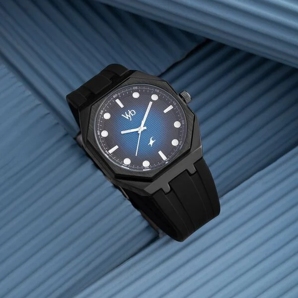 The Vyb Rebel By Fastrack Quartz Analog Multicoloured Dial Black Silicone Strap Watch For Guys is a bold and edgy timepiece designed for those who love to stand out. Featuring a vibrant multicoloured dial paired with a sleek black silicone strap, it delivers a dynamic and youthful look perfect for casual and sporty styles. The durable mineral glass protects the dial, while the uniquely shaped metal case (47.5 mm x 43 mm) adds a distinctive touch to its design. Powered by precise quartz movement and secured with a classic buckle closure, this watch ensures accurate timekeeping, comfort, and long-lasting performance for everyday adventures.
